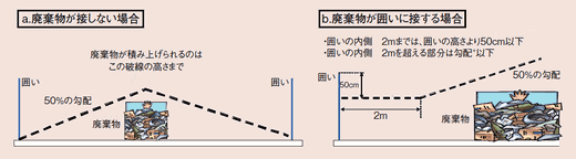 a.廃棄物が囲いに接しない場合は、囲いの下端から勾配50%以下。