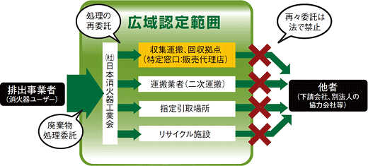 消火器工業会から業務委託を受けることにより、広域認定範囲で本システムに参加する事業者(特定窓口、指定引取場所、運搬業者、リサイクル施設〔処分会社〕)は、廃消火器の取扱いにあたって廃棄物処理法(廃棄物の処理及び清掃に関する法律(昭和四十五年十二月二十五日法律第百三十七号))の適用を受けますので、厳重な注意が必要となります。